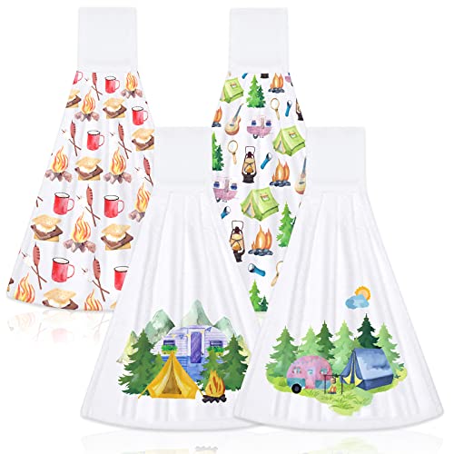 Vansolinne Camping Hanging Kitchen Towels 12” x 17” Set of 4 Happy Camper S’More Hand Towels Soft Coral Velvet Dish Towel for Kitchen Bathroom Novelty Christmas Housewarming Gift Idea
