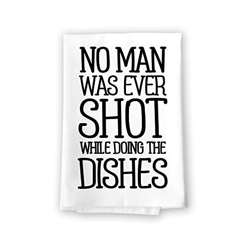 Honey Dew Gifts Funny Kitchen Towels, No Man was Ever Shot While Doing The Dishes Flour Sack Towel, 27 inch by 27 inch, 100% Cotton, Highly Absorbent, Multi-Purpose Kitchen Dish Towel