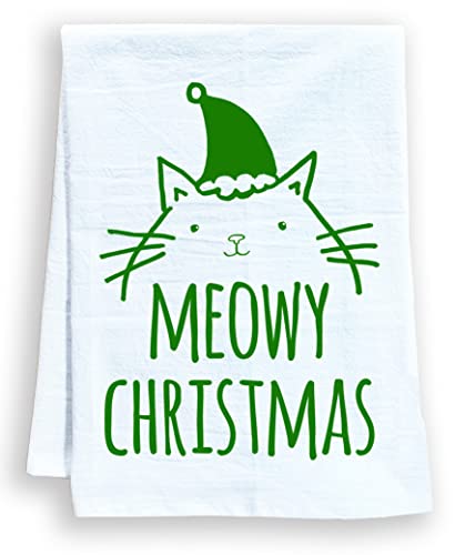 Funny Holiday Dish Towel, Meowy Christmas, Flour Sack Kitchen Towel, Sweet Housewarming Gift, Farmhouse Christmas Decor, White (Green Ink)