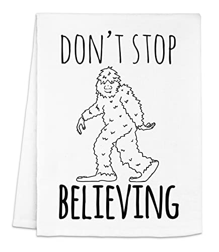 Funny Kitchen Towel, Don’t Stop Believing, Flour Sack Dish Towel, Sweet Housewarming Gift, White