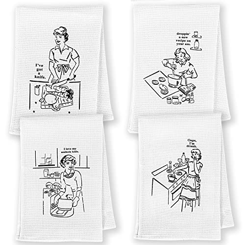 BOMBAXCEIBA Funny Kitchen Towels and Dishcloths Sets of 4,Gift for Mom, New Home Decorative Dish Towels for Women, Waffle Weave Tea Towels for Kitchen (17 x 25 Inches)