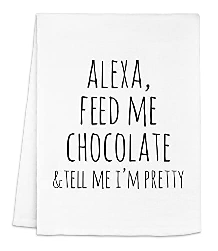Funny Dish Towel, Alexa Feed Me Chocolate & Tell Me I’m Pretty, Flour Sack Kitchen Towel, Sweet Housewarming Gift, Farmhouse Kitchen Decor, White or Gray (White)