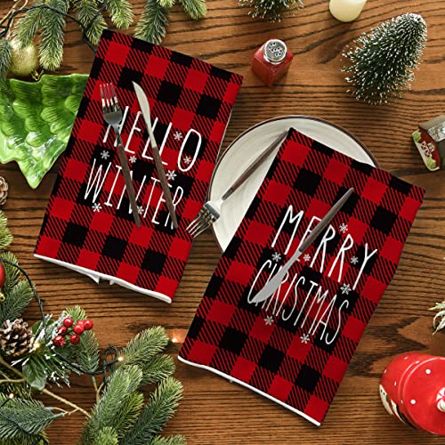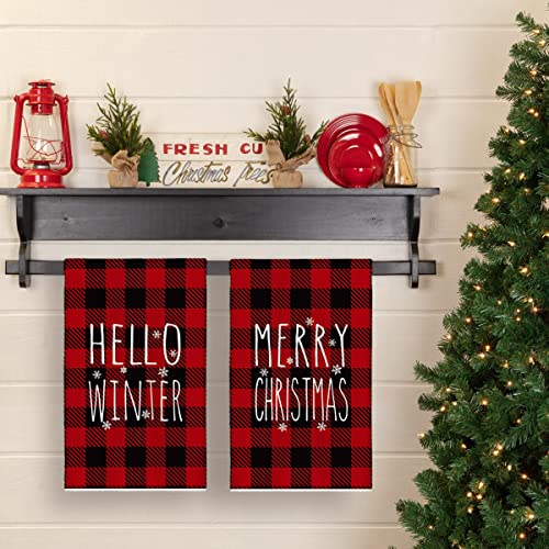 Artoid Mode Buffalo Plaid Merry Christmas Kitchen Towels Dish Towels, 18×26 Inch Hello Winter Seasonal Decoration Hand Towels Set of 2