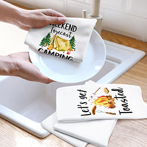 Vansolinne Camping Kitchen Towels Set of 4 Dish Towels White Kitchen Hand Towels Kit Printed with Funny Sayings Novelty Gifts for Campers Happy Camper Camping Accessories for RV Campers