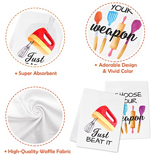 ADORABLE DESIGN – This Funny Kitchen Towels set includes 4 PCS towels with funny quotes, printed with patterns of kitchenwares, and knife, pig, mixer respectively. These lovely, interesting, and color-vibrant towels will certainly win the cook’s heart!