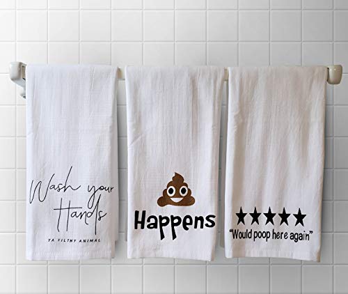 EASY CARE- Machine washable in cold water with other towels. Every set comes with 3 towels. Kitchen set features fun avocado theme towels with one printed, colorful towel, one towel that says “Gauc is extra but so am I” and one towel with “Avo a nice day”. Home set features black and white sayings: “Happiness is handmade” “HOME” with a heart, and “This is our happy place”. Bathroom set features “Poop emoji happens” “5 stars would poop here again” review, and “Wash your hands ya filthy animal”.