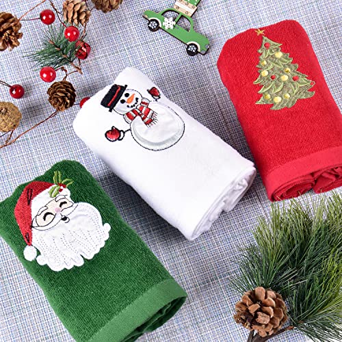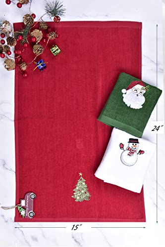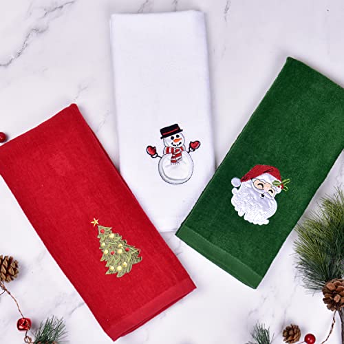 Christmas Towels Set of 3: This set of 3 christmas hand towels features 3 kinds of fun Christmas embroidered pattern included santa claus, snowman and christmas tree. Each towel measures 24″ L x 15″ W.