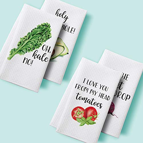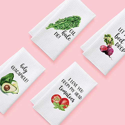 KLL Funny Kitchen Tea Towels Foodie Housewarming Gift- Set of 4 Dish Waffle Vegetables Towels Gift for Wedding Shower Fun Hostess Kitchen Decor Christmas New Home