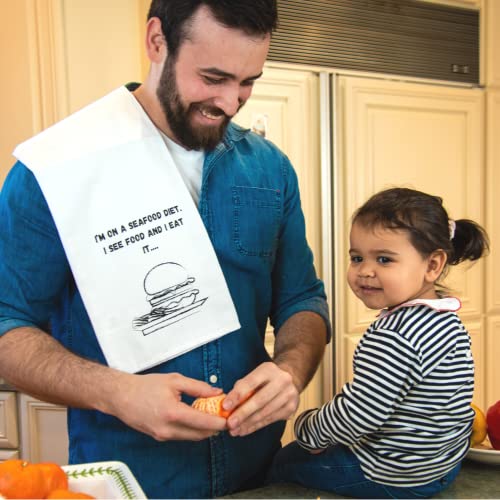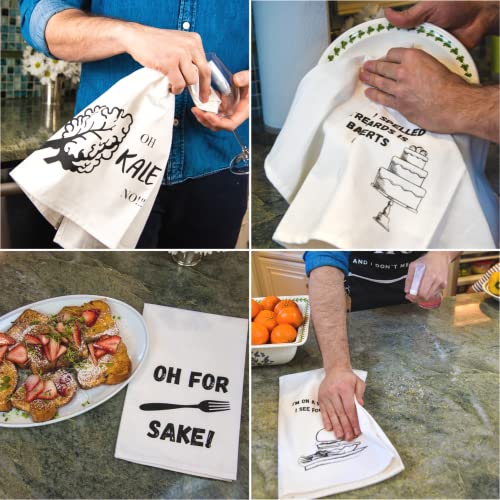 😁WITH 4 UNIQUE FUN KITCHEN TOWELS, our kitchen towel sets feature BEAUTIFULLY PRINTED ILLUSTRATIONS and the PHRASES “Stressed spelled backwards is desserts”, “Oh for (forks) sake!”, “I’m on a seafood diet. I see food and I eat it…” and “Oh kale no!!!” Our funny dish towel set is the secret ingredient you’ve been missing. After all, nothing pairs with great cooking like a great sense of humor!