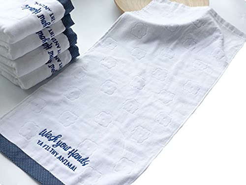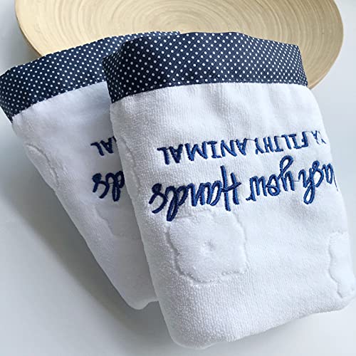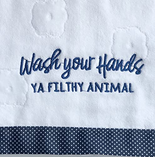 Cute sayings and fun embroidery:embroidered with inchwash your hands ya filthy animalinch100percent Cotton with Velour Finish:Protected textiles meet high safety and environmental standards.Made of 100percent cotton for softness and tear-resistant strength,quickly absorb moisture and quickly dry.Superb stunning towels includes:Color:2 xwhite( blue borders), washcloths for face and body.Size:28.7 x13.7 inch GSM:400+Material: Organic Combed CottonWeight: 7ounce/2 x3.5ounce Designed with features an exquisite stitched edge:Our towel hems are professionally double-stitched to increase durability, and these towels do fluff up nicely after the initial wash.Perfect Hand Towel in Modern Velour Jacquard Design:This premium white hand towel set is a splendid and fashionable addition to refresh your bathroom as well to set an impressive latest and modern look.Perfect for hotel, beach, pool, spa, and home.CARE TIPS: Machine washable towels. We recommend washing in cold water before your first use. This allows the premium cotton fibers to open up and give the towels better absorbency. Tumble dry on low heat or hang them to dry. Please don’t use fabric softener, dry sheets, and/or bleach. Chemicals will only reduce the softness of the material.Peace of Mind Provided by FITFITNESS’ No-Hassle Service and SupportUnsatisfied for any ReasonJust let us Know and we’re going to Make it Right.