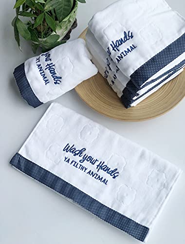 SPOIL YOUR LOVED ONES WITH THE MOST AMAZING HOUSE WARMING GIFT!: The 100% organic cotton materials, personalized design and luxurious feel of our bathroom towels set will surely mesmerize your family and friends! This soft terry towel set features a jacquard pattern with “wash your hands,ya filthy animal” embroidery. Cute sayings and fun embroidery add cheer to hand washing and healthy habits.Let our bathroom hand towels greet guests in your powder room, or give them as a gift for a new neighbor