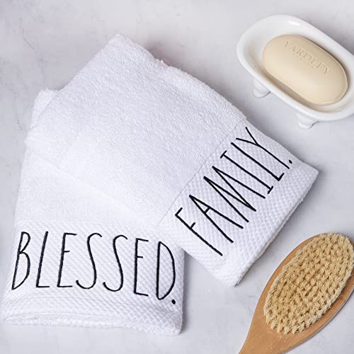 ADD SIMPLE RAE DUNN STYLE TO YOUR HOME: Accessorize your house with this hand towel set featuring “BLESSED” & “FAMILY” embroidered in Rae Dunn’s signature font.